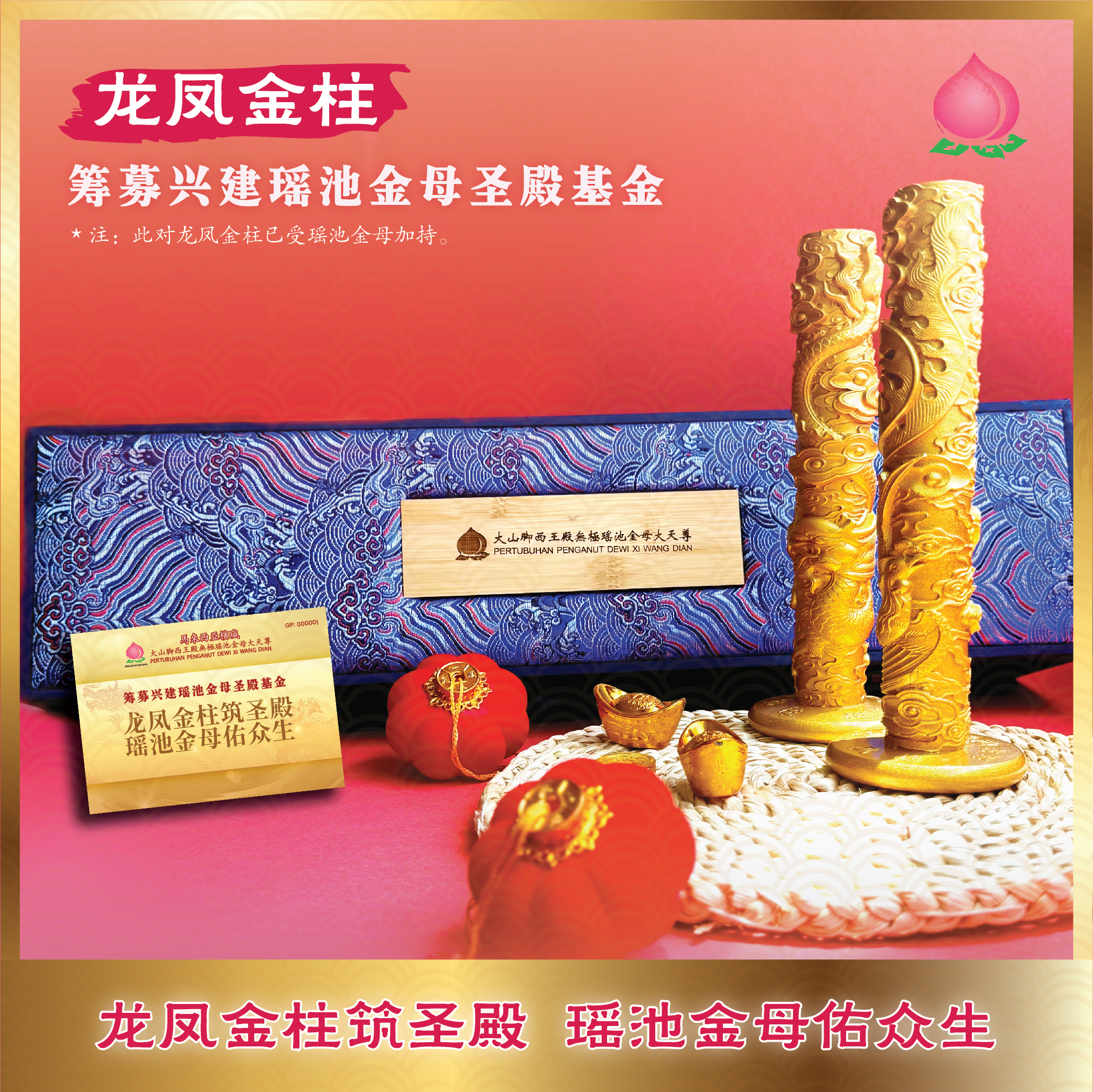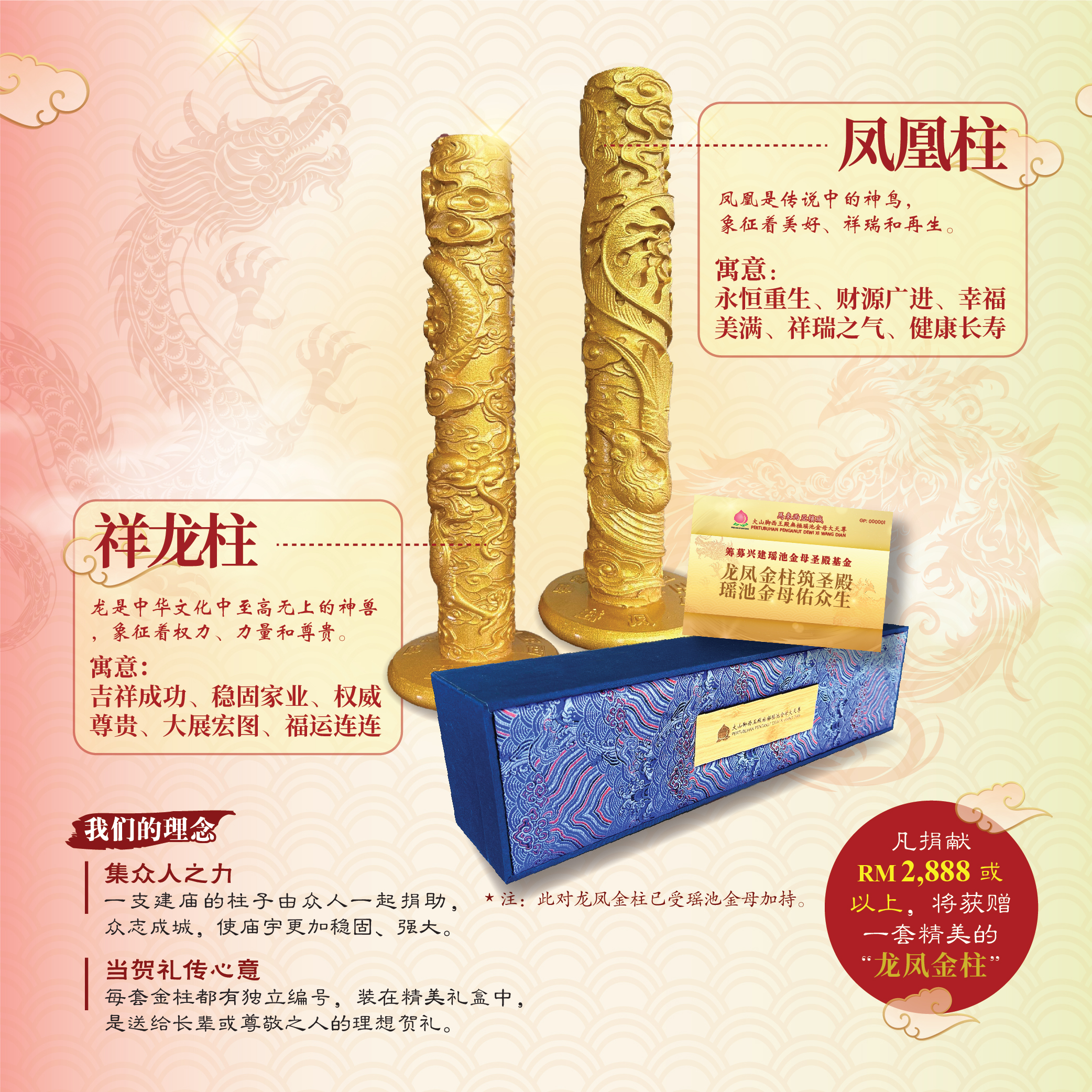 凡捐献 RM 2,888 或以上,将获赠一套精美的 “龙凤金柱”